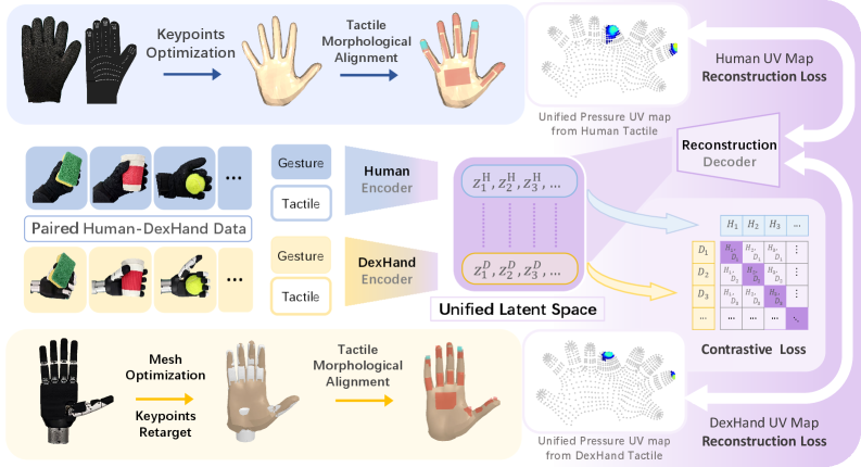 그러나 더 근본적 문제는 동일한 조작 동작에서도 기구학 차이 때문에 접촉 패턴이 다르다는 것이다. 인간이 5손가락으로 컵을 잡을 때의 촉각 패턴과, 4손가락 로봇(LEAP Hand)이 같은 컵을 잡을 때의 촉각 패턴은 근본적으로 다르다 — 접촉 면적, 힘 분포, 손가락별 역할이 모두 다르기 때문이다.